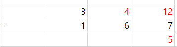 이때는 일의 자리를 보면 2 - 7 이 불가능 하기에 352 의 10의 자리에서 10을 내림을 하게 되면 340 이 남고 12 - 7 이 가능하게 됩니다.