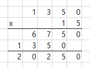 1350 x 15 = 1350 x 5 + 1350 x 10 = 6750 + 13500 = 20250