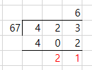 423 ÷ 67 의 몫은 6 이고 나머지는 423 - 402 = 21 이 됩니다.