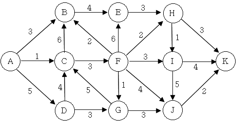 다음은 각 지점을 연결하는 도로 상황을 나타내는 그림이다. 각 도로는 화살표를 따라 일방통행만 가능하며 화살표 위에는 도로 이용 시 드는 비용이 쓰여 있다. A지점부터 K지점까지 가는데 드는 최소 비용은 얼마인가?