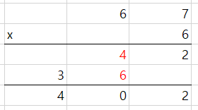 다음과 같이 67개 들이가 6개 있는 것을 계산하는 67 * 6를 계산하는 방법을 살펴 보면