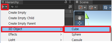 2. 점프 할 큐브 생성 - 하이라키에서 + 기호 눌러서 3D Object -> Cube 클릭 해서 객체 생성