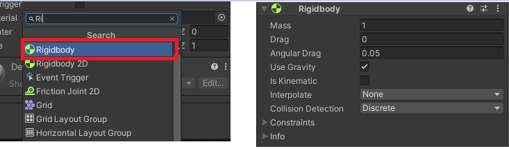 - 큐브에 중력 컴포넌트인 Rigidbody 추가 : Add Component 클릭하여 Rigidbody 검색해서 추가