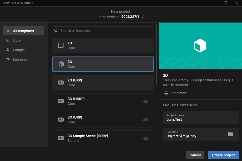 새 프로젝트 생성 - 3D 선택 후 JumpTest