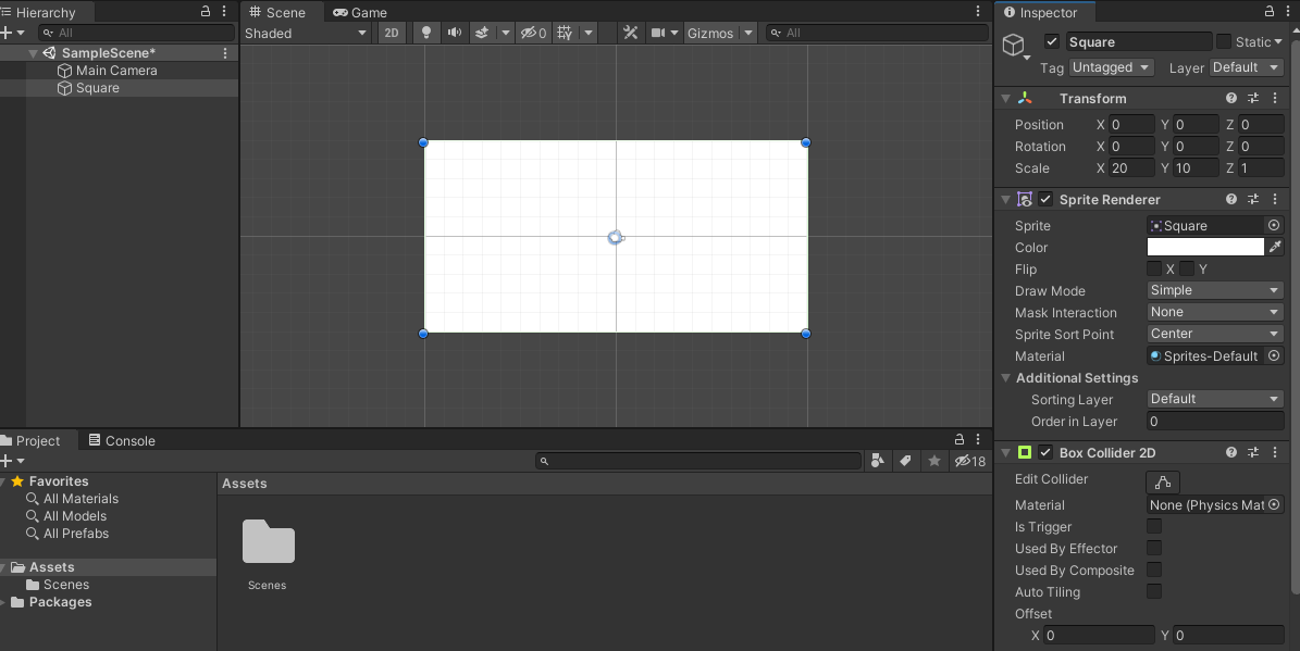 1. 먼저 오브젝트가 생성되는 위치와 범위를 결정하기 위해 객체 생성(Square 생성하여 크기를 x:20,y:10 )