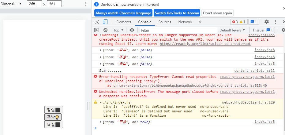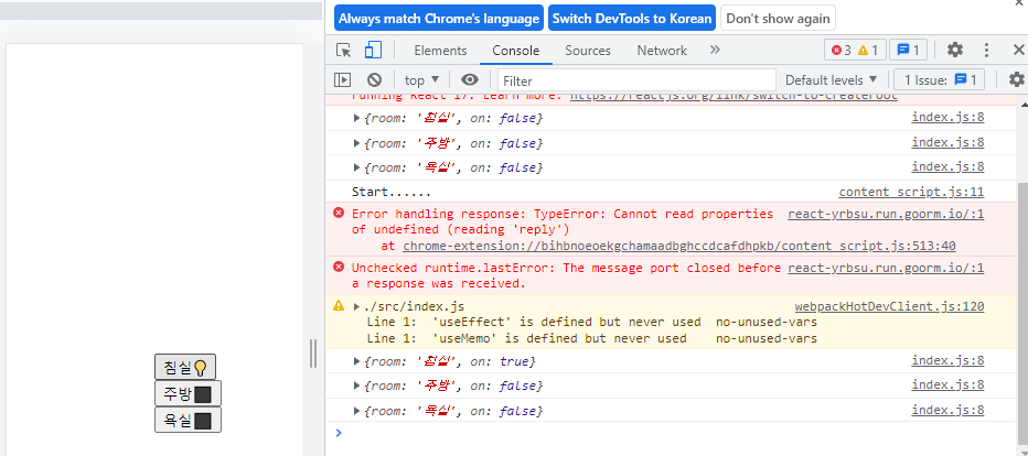 실행해 보면 주방을 켰을 때 주방의 이벤트만 발생하는 것을 알 수 있습니다.