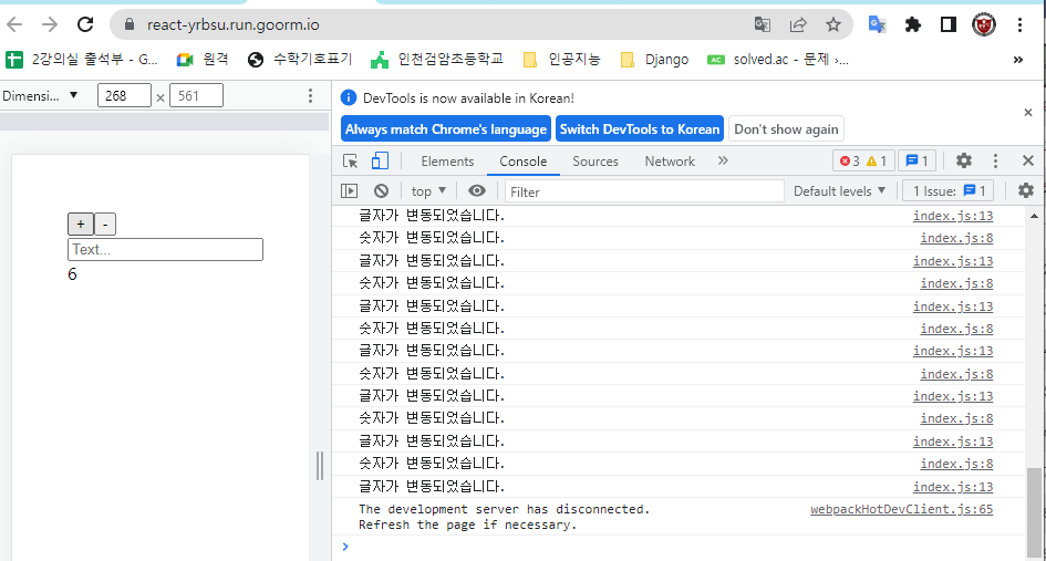 숫자나 글자가 변경되었을 때마다 둘 다 출력 되는 것을 확인 할 수 있다.