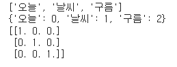 원핫인코딩한 결과 오늘: 0, 날씨: 1, 구름: 2 와 같이 숫자로 변환 후 원핫벡터 생성하면 위와 같이 나타난다.