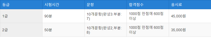 등급별 시험시간, 문항, 합격점수,응시료