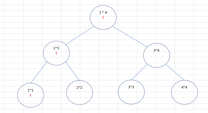 그리고 (1,1) 구간에 달걀이 있다는 첫번째 정보가 들어오면 세그먼트 트리의 x가 1이므로 1번째 세그먼트 트리를 다음과 같이 생성합니다.