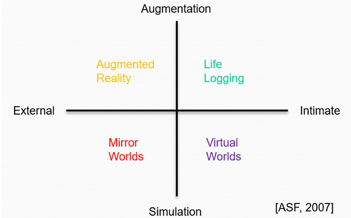 두 축(증강-시뮬레이션,외적-사적)을 기준으로 메타버스를 증강현실(Augmented reality), 라이프로깅(Life Logging), 거울 세계(mirror World),가상세계(virtual worlds) 으로 분류 할 수 있다.