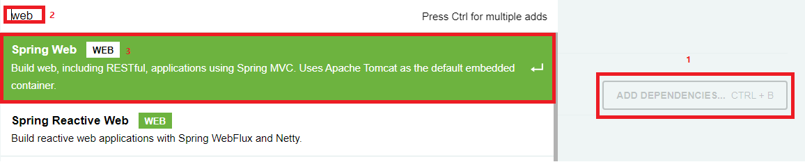 - 화면 오른쪽에 있는 Dependencies - ADD EDPENDENCIES... 버튼을 클릭하고 web을 입력후 Spring Web 의 WEB 버튼을 클릭한다.
