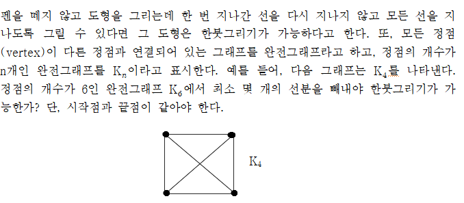 시작점과 끝점이 같기 위해서는 모든 정점의 연결선이 짝수이어야 한다. 따라서 최소 3개이 선을 빼야만 모두 짝수가 된다.