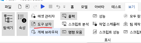 도구상자가 보이지 않는다면 뷰->도구상자를 클릭하여 열어 볼 수 있다.