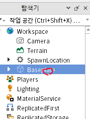 - Workspace 의 SpawnLocation 을 찾아서 선택(만약 없으면 Workspace 옆의 + 버튼을 클릭하여 SpawnLocation 추가)