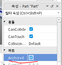 속성->파트-> Anchored를 체크 해 준다.