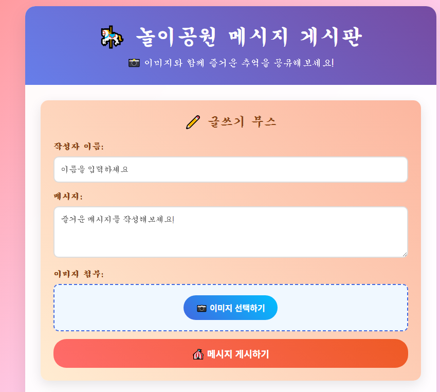 안녕하세요! 이번 시간에는 우리가 3장에서 만든 메시지 게시판에 이미지 첨부 기능을 추가해볼 거예요! 마치 놀이공원에서 사진을 찍고 전시하는 것처럼 말이에요! 📸